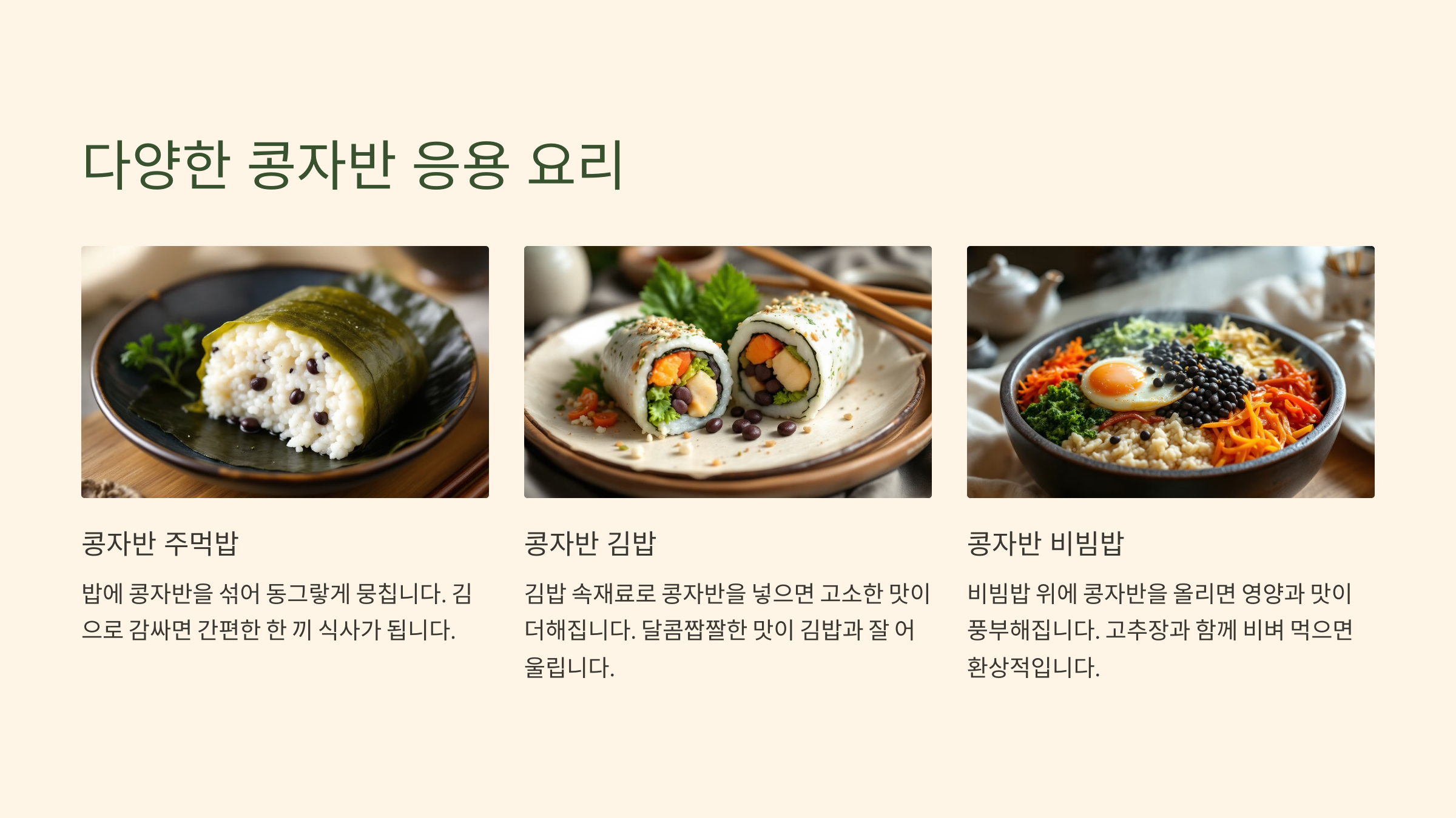 이처럼 콩자반은 다양한 방식으로 활용할 수 있어요. 평소 먹던 방식에서 벗어나 색다르게 즐겨보세요! 🌟
