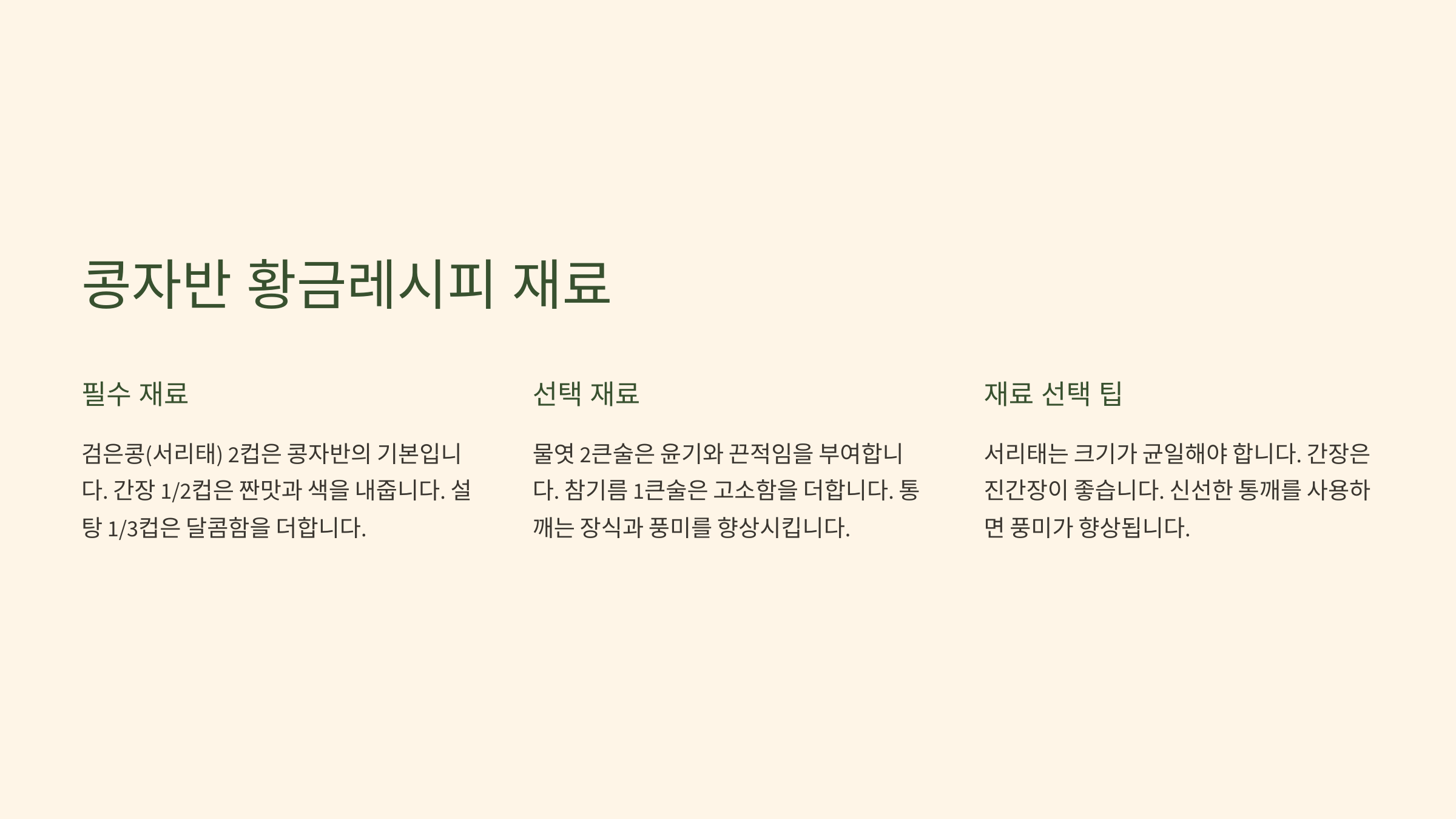 콩자반의 영양을 알았으니, 이제 본격적으로 황금레시피 재료와 만드는 법을 알려드릴게요! 🍳