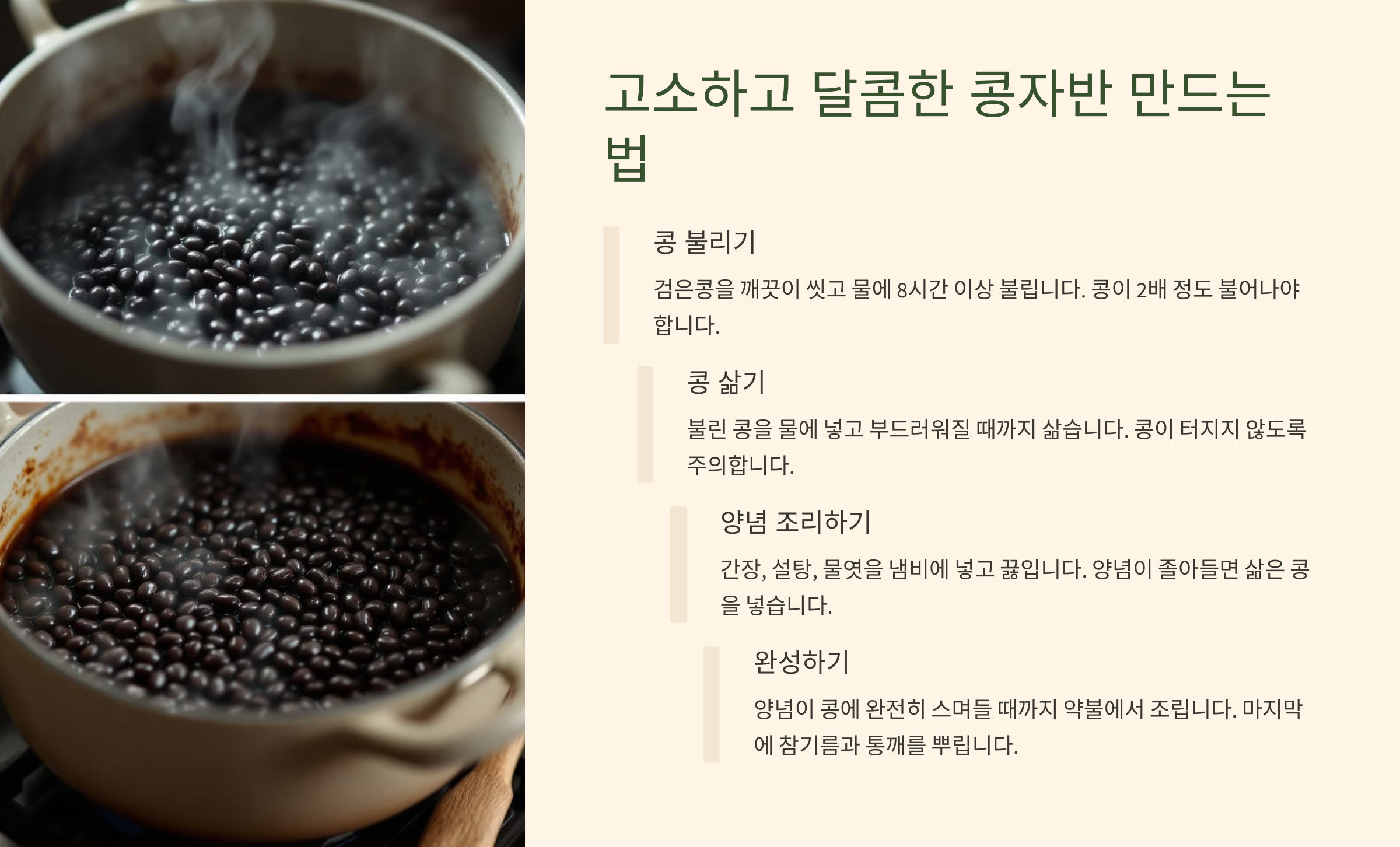 콩자반을 만들 때 가장 중요한 것은 콩을 적절하게 불리고, 양념이 잘 배도록 조리는 과정이에요. 차근차근 따라 해보세요! 👩🍳👨🍳