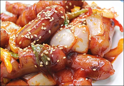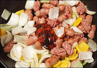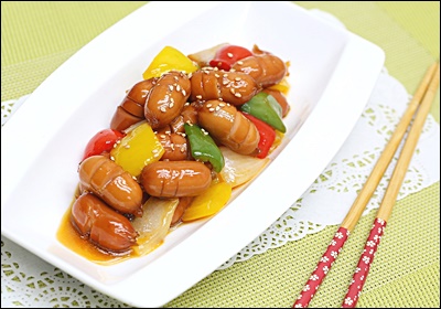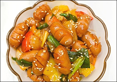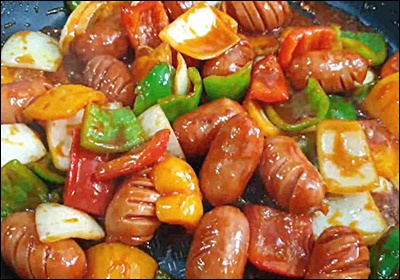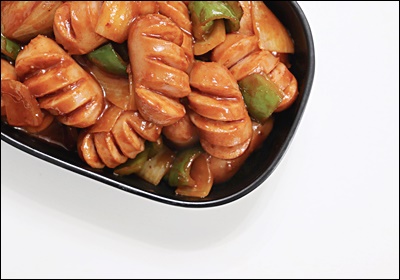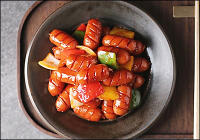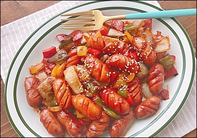 소세지는 훈연형, 후랑크, 비엔나, 치킨 소시지 모두 가능해요. 껍질이 있는 타입은 사선 칼집을 넣으면 팽창해도 터지지 않고 양념이 잘 스며들어요.