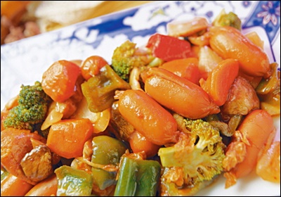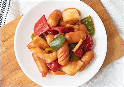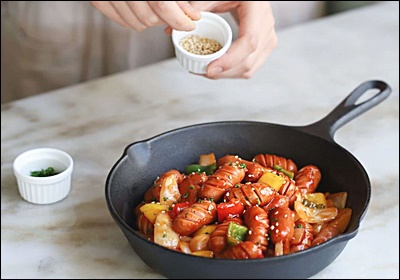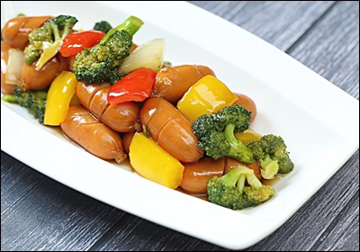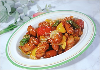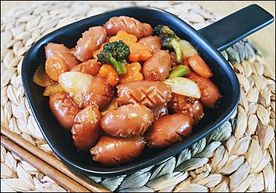 A6. 가능해요. 소세지와 채소를 오일, 소스에 버무려 180도 8분 돌린 뒤 팬에서 1분만 합쳐 윤기를 내요.