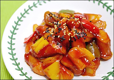 간장과 케첩의 조합은 감칠과 산미, 당의 균형을 만들어줘요. 케첩 양이 많으면 광택은 좋지만 타기 쉬워서 불을 내려야 해요.