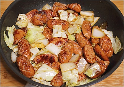강불 유지가 어렵다면 팬을 두 개로 나눠 작업해요. 첫 팬에서 소세지를 굽고, 두 번째 팬에서 채소를 볶은 뒤 합칠 수 있어요.